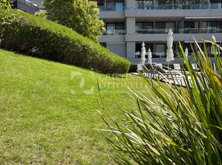 Living-comedor con salida a amplia terraza con parrillero. 2 dormitorios (suite con vestidor), 2 baños. Cocina integrada equipada con horno, anafe y campana. Lavadero. Calefacción. AA. 2 Garages y box. Amenities: piscina, barbacoa, gimnasio, playroom. Camaras. Seguridad 24 hs.